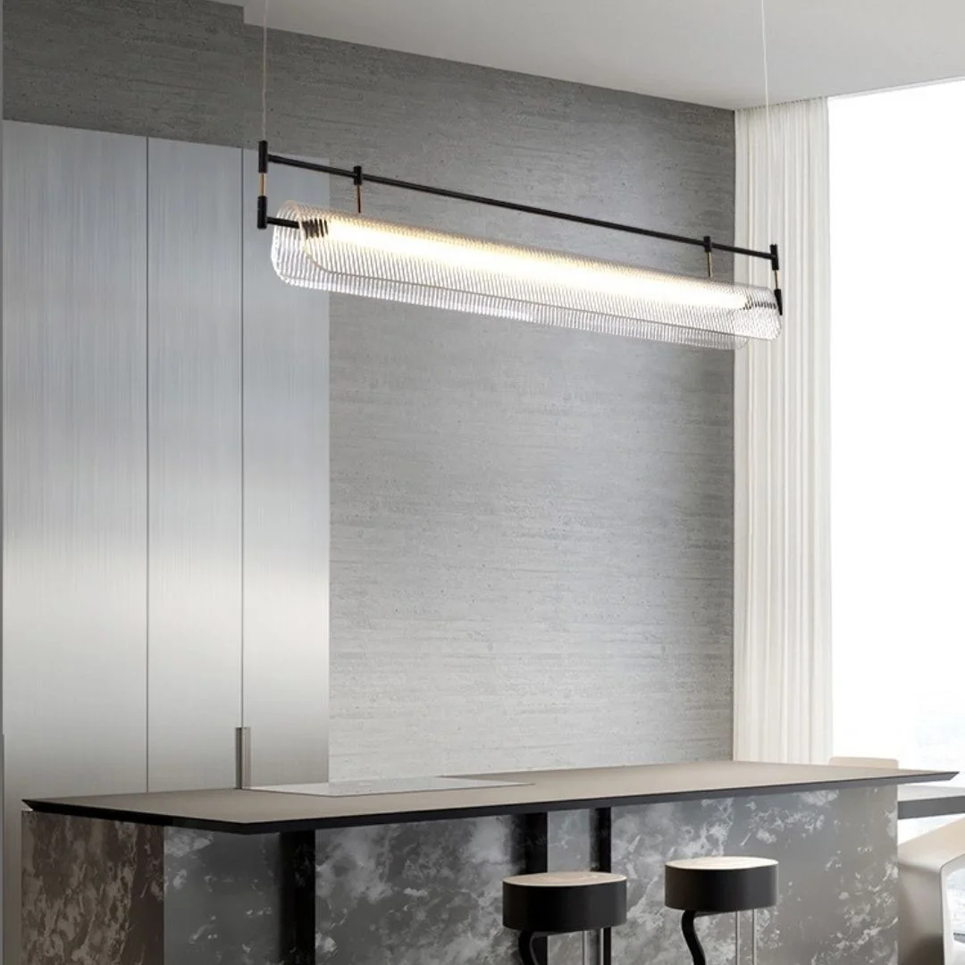 Mẫu đèn này nổi bật với thiết kế thanh ngang dài, treo thả bằng hai dây mảnh, tạo cảm giác gọn, thoáng và rất hiện đại khi xuất hiện trong không gian. Phần thân trên mang tông màu tối thanh lịch, kết hợp cùng khối tán sáng kéo dài bên dưới với đường nét bo cong mềm mại, giúp tổng thể đèn vừa có sự mạnh mẽ của cấu trúc thẳng, vừa có sự nhẹ nhàng của ánh sáng khuếch tán. Chính sự đối lập hài hòa này khiến sản phẩm đặc biệt phù hợp với bàn ăn dài, đảo bếp, quầy bar, khu vực tiếp khách hoặc không gian làm việc theo phong cách modern, minimalist, contemporary hay modern luxury.