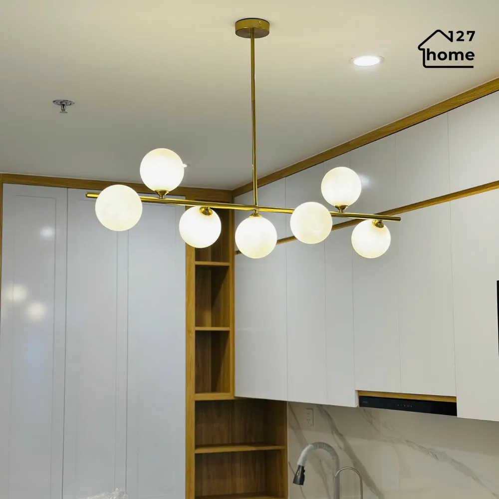Đèn Thả Trần Tacsy TTK85N7 sở hữu kiểu dáng ngang với 7 bóng thủy tinh tròn Ø120, được sắp xếp cân xứng trên thanh hợp kim mạ vàng. Thiết kế này tạo nên sự hài hòa, sang trọng, thích hợp làm điểm nhấn cho không gian nội thất cao cấp.