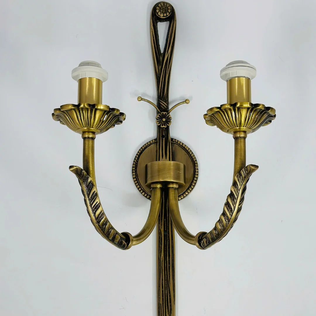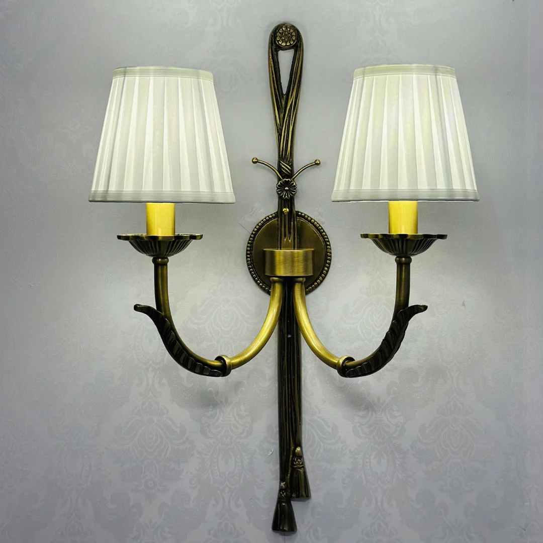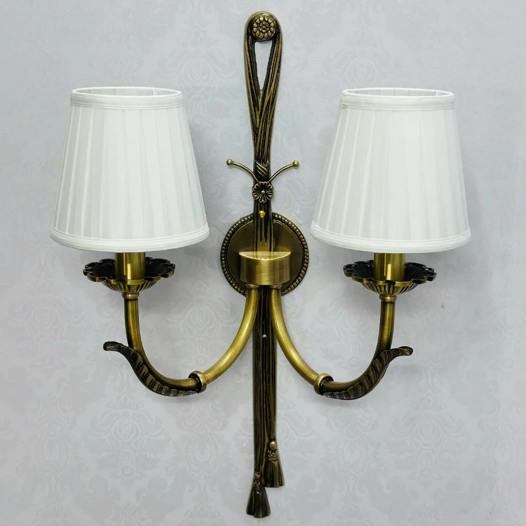 Đèn Tường Đồng VDC08 mang phong cách tân cổ điển thanh lịch với thân đèn tông vàng đồng sang trọng, các đường nét uốn cong mềm và điểm nhấn trang trí ở trục giữa tạo cảm giác tinh xảo khi nhìn gần. Hai tay đèn vươn cân đối, mỗi tay đi kèm chao vải sáng màu dáng loe nhẹ, giúp tổng thể gọn gàng nhưng vẫn nổi bật trên tường.