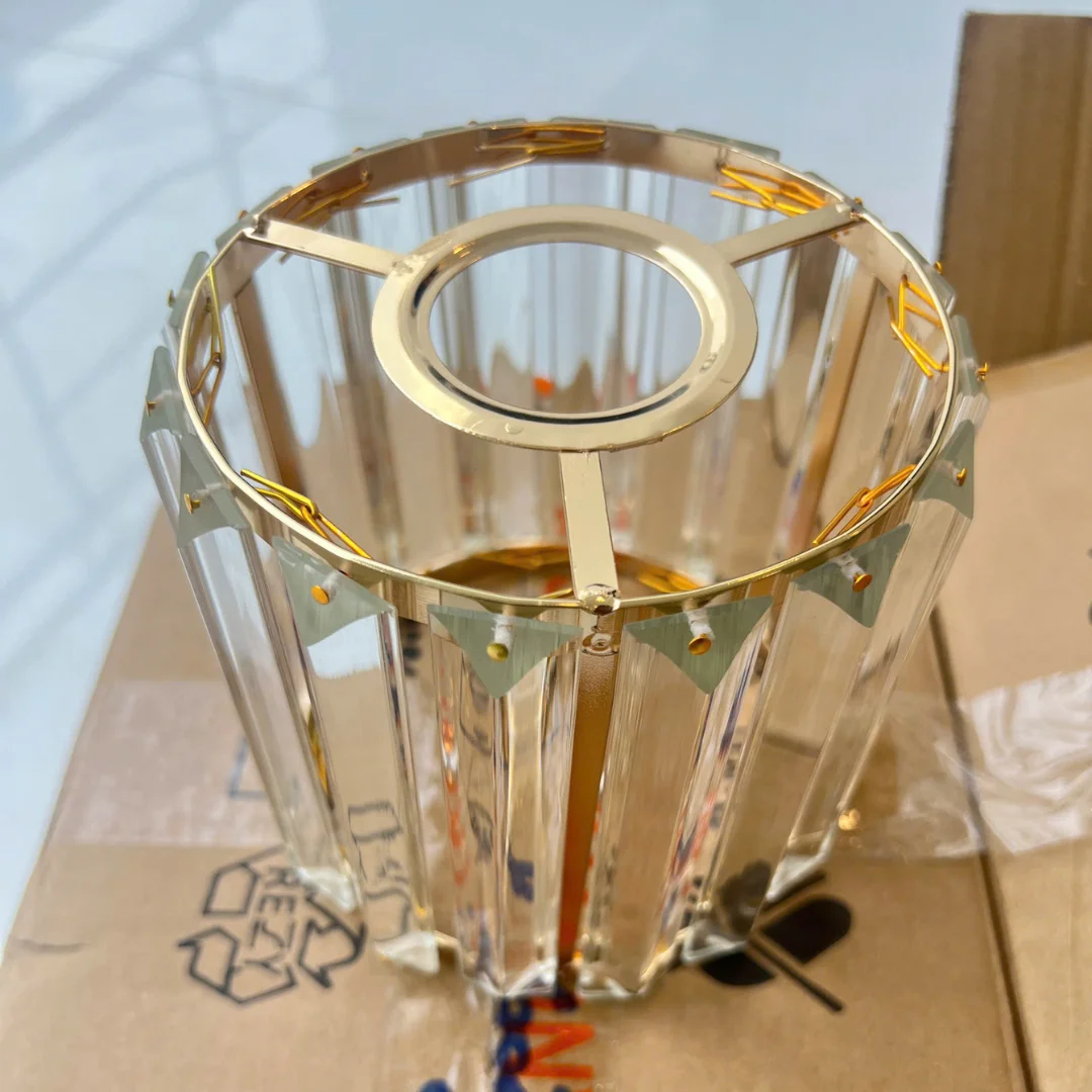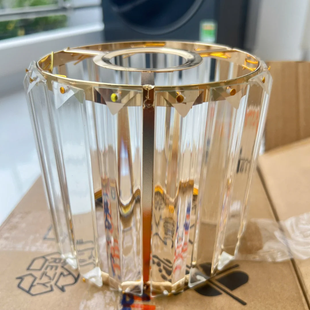 Sản phẩm kết hợp giữa pha lê ở phần chao và kim loại tông vàng ở tay đèn, đế đèn. Phần pha lê giúp ánh sáng phát ra dịu hơn, trong hơn và tạo hiệu ứng đẹp mắt cho khu vực lắp đặt. Phần kim loại giữ kết cấu chắc chắn, đồng thời mang lại vẻ sang trọng ấm áp, giúp chiếc đèn dễ hòa hợp với nội thất hiện đại, thanh lịch hoặc phong cách sang nhẹ.