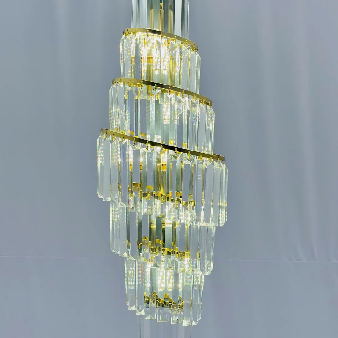 Đèn Tường Pha Lê VPL31 có thiết kế dạng đứng cao, phần thân đèn được tạo thành từ nhiều tầng pha lê xếp lớp theo chiều dọc, tạo nên tổng thể rất nổi bật và có chiều sâu. Khi nhìn trực diện, mẫu đèn mang cảm giác như một khối trang trí ánh sáng sang trọng, phù hợp với những mảng tường lớn hoặc khu vực cần điểm nhấn rõ ràng. Đây là kiểu đèn đặc biệt hợp với phòng khách, sảnh, cầu thang và những không gian muốn tăng cảm giác bề thế.