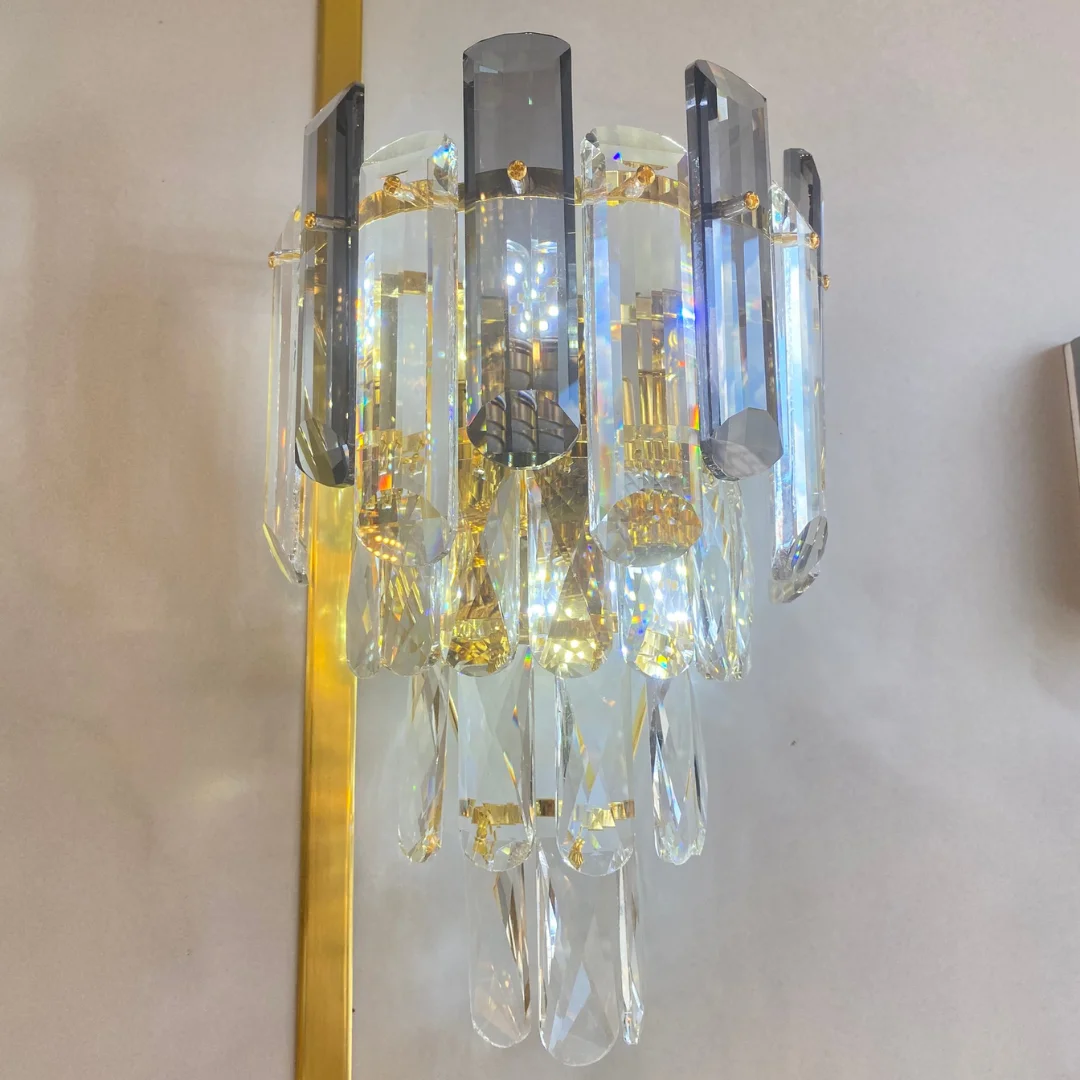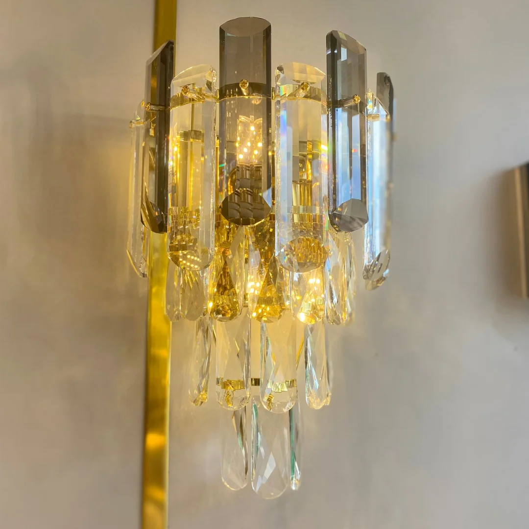 • Thiết kế pha lê nhiều lớp giúp chiếc đèn tạo điểm nhấn rõ ràng cho bức tường mà không cần thêm quá nhiều đồ trang trí.