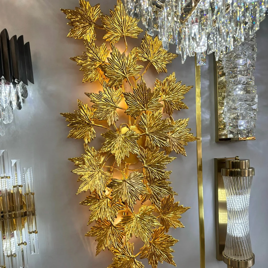 Sản phẩm mang sắc kim loại ánh vàng kết hợp cùng hiệu ứng phản sáng của dòng đèn tường pha lê, giúp ánh sáng trở nên lung linh và sang hơn khi bật đèn. Các chi tiết tạo hình lá được xử lý tinh xảo, vừa tạo cảm giác cao cấp vừa giúp ánh sáng lan tỏa đẹp hơn trên bề mặt tường. Nhờ sự kết hợp này, VPL928 phù hợp với những không gian hiện đại, luxury hoặc các công trình cần một điểm nhấn mang tính nghệ thuật rõ rệt.