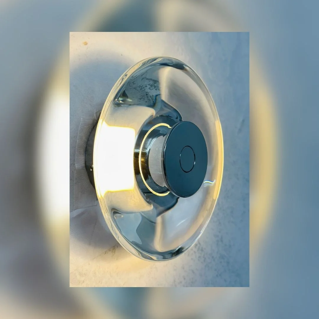 Đèn Tường Thiết Kế VK155 được thiết kế như một đĩa thủy tinh tròn, phần tâm là lõi kim loại màu tối tạo điểm nhấn mạnh mẽ. Khi bật sáng, ánh sáng khuếch tán qua lớp kính trong, vừa chiếu vào tường, vừa phản xạ qua bề mặt cong, tạo nên hiệu ứng quầng sáng lan tỏa rất sang và lạ mắt. Form đèn gọn, tròn trịa, bám sát tường nên không chiếm diện tích, phù hợp cả những mảng tường hẹp.