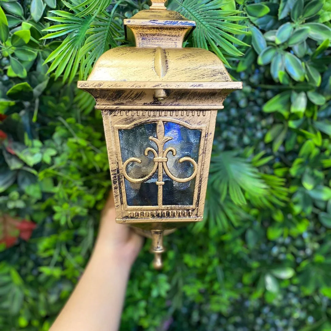 Đèn tường VNT6635 được thiết kế dạng lồng đèn vuông cổ điển, phần mái xếp tầng mềm mại kết hợp thân đèn vát cạnh và những họa tiết trang trí tinh xảo ở bốn mặt kính. Tông màu giả đồng ánh vàng giúp chiếc đèn nổi bật trên nhiều màu tường khác nhau, mang lại cảm giác sang trọng và ấm cúng. Thân Đèn Tường VNT6635 làm từ kim loại sơn tĩnh điện chắc chắn, bề mặt bền màu, hạn chế gỉ sét khi sử dụng lâu dài; phần kính trong suốt vừa bảo vệ bóng E27 bên trong, vừa giúp ánh sáng tỏa đều, dịu mắt và an toàn khi dùng ngoài trời.