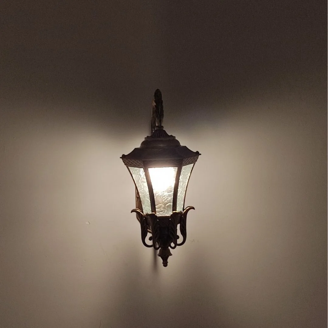 Đèn Tường VNT6698 sở hữu kiểu dáng đèn lồng cổ điển với phần tay đèn uốn cong nối từ đế tường ra chụp đèn, mang lại cảm giác mềm mại nhưng vẫn rất bề thế. Phần chụp được chia thành nhiều ô kính, phía trên là nắp đèn dạng mái vòm, phía dưới là chi tiết hoa văn lá uốn cong tinh xảo, giúp chiếc đèn trở nên nổi bật ngay cả khi chưa bật sáng. Khi thắp sáng, ánh sáng từ bóng E27 xuyên qua lớp kính hoa văn, tạo hiệu ứng lấp lánh nhẹ, rất phù hợp cho lối đi, hiên nhà, tường cổng hoặc ban công.