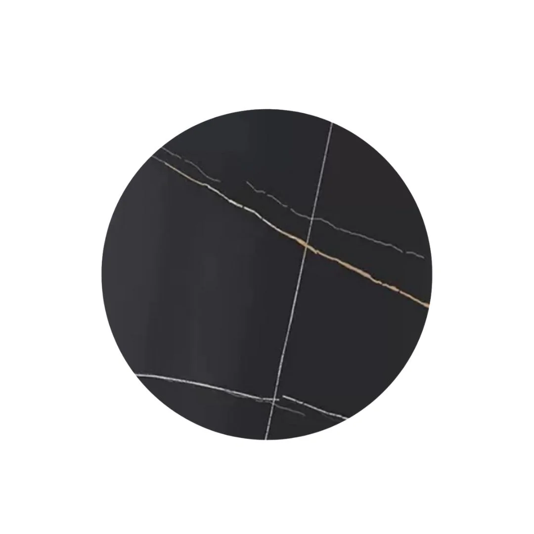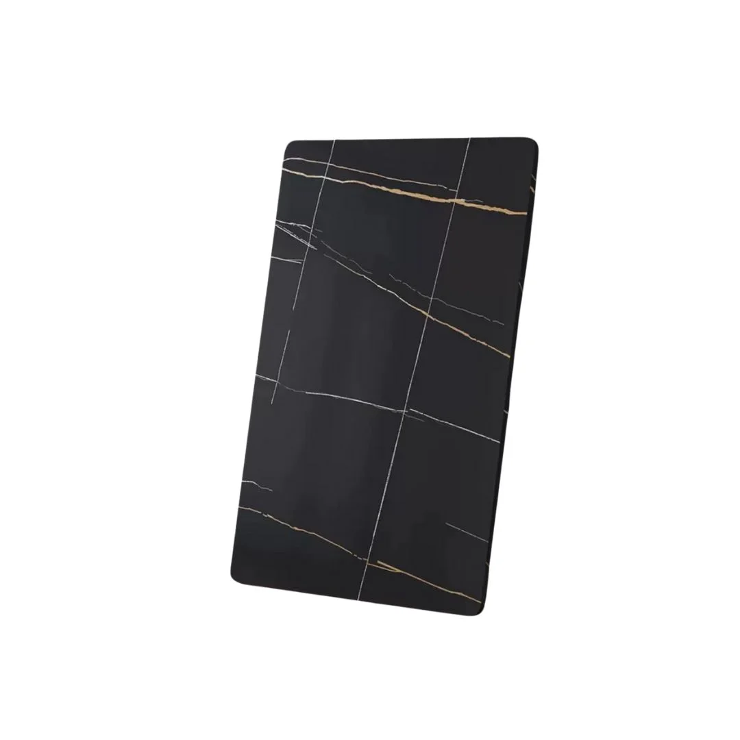 Phiến đá chữ nhật bo góc mềm, tông đen nhám điểm vân sọc vàng – bạc chạy dọc, tạo chiều sâu và cảm giác sang trọng. Lên bàn ăn kết hợp nhiều kiểu chân (chữ V, chữ U, trụ đơn) đều hài hòa.
