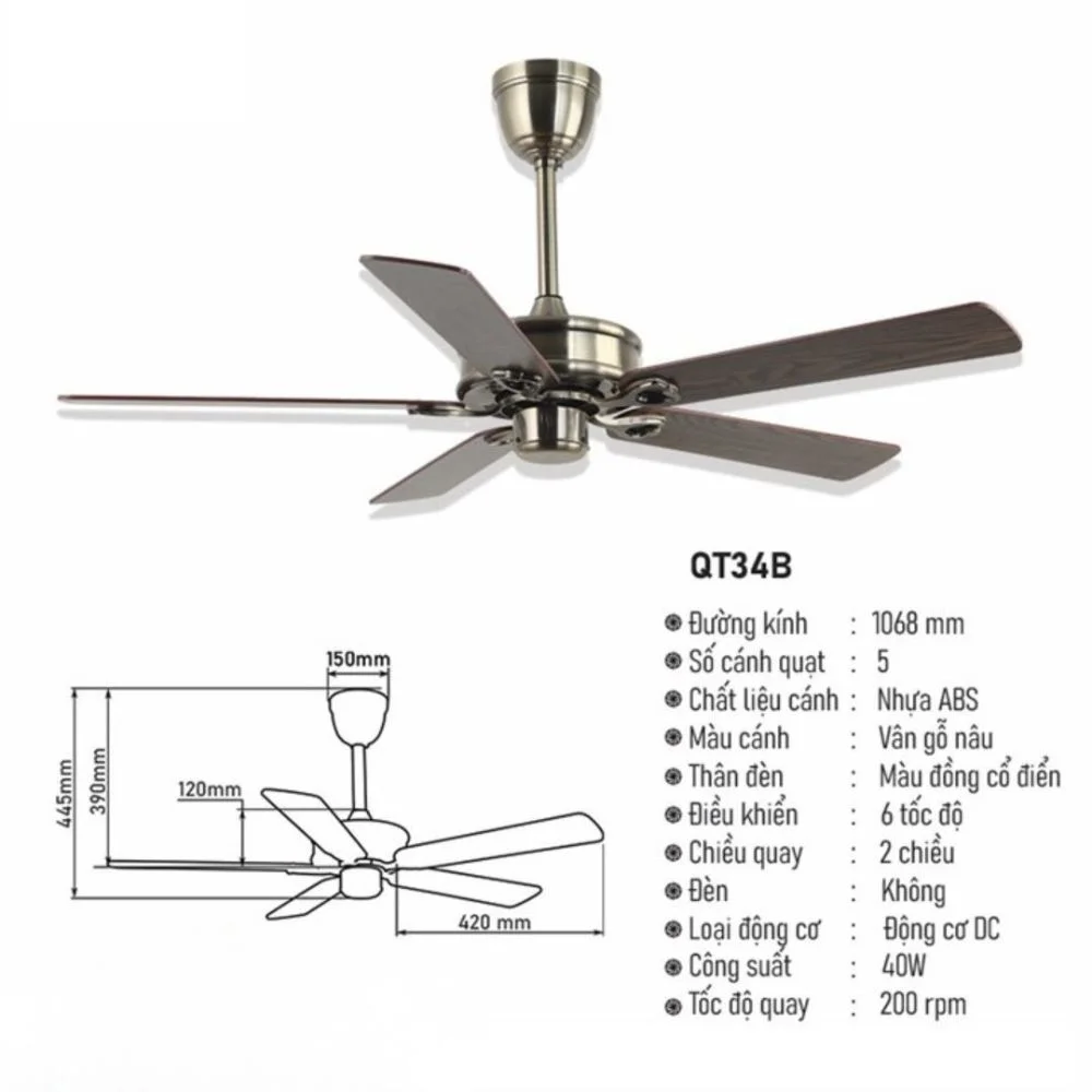 - Thiết kế tinh tế với thân quạt màu trắng, đồng cổ điển hoặc đen sang trọng, kết hợp cùng cánh vân gỗ tự nhiên tạo điểm nhấn thẩm mỹ nổi bật cho không gian.