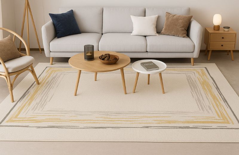 Thảm Dệt 3D SF3DGD01 gây ấn tượng với thiết kế khung viền loang màu độc đáo, kết hợp tinh tế giữa các gam trung tính như kem, vàng nhạt và xám tro. Họa tiết được xử lý khéo léo, tạo hiệu ứng chiều sâu 3D giúp không gian trở nên rộng rãi và sang trọng hơn.
