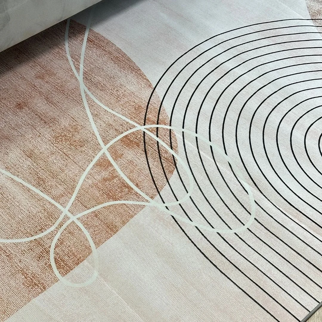 Thảm Sofa In 3D SFINH1 sở hữu thiết kế mang phong cách hiện đại với những đường nét mềm mại, nghệ thuật. Họa tiết chính gồm các đường cong hình bán nguyệt lặp tầng kết hợp với đường vẽ uốn lượn tinh tế, tạo nên cảm giác chuyển động nhẹ nhàng trên bề mặt thảm.