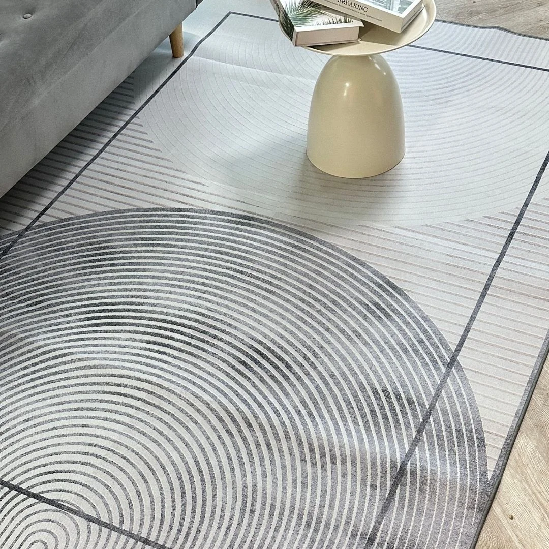 Thảm sofa in 3D SFINH6 gây ấn tượng với thiết kế họa tiết bán nguyệt kết hợp đường kẻ đồng tâm, tạo hiệu ứng thị giác mạnh nhưng vẫn giữ được nét tinh giản đặc trưng của phong cách hiện đại.