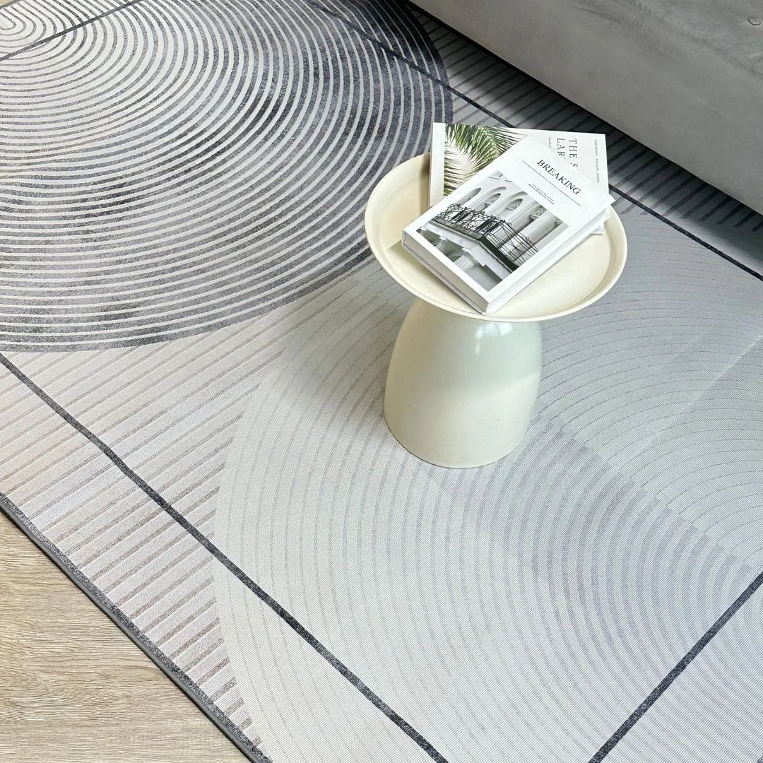 Nền thảm được phối giữa các gam màu xám – trắng trung tính, dễ kết hợp với nhiều tone nội thất. Khung viền hình chữ nhật bao quanh càng tăng cảm giác gọn gàng, giúp không gian trở nên cân đối và sang trọng hơn.