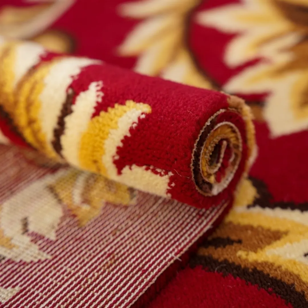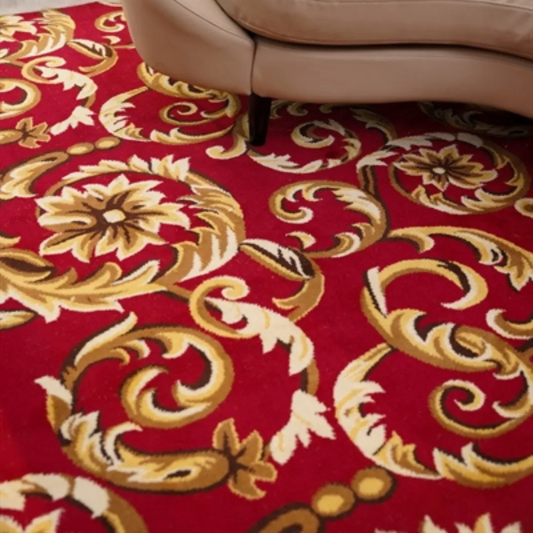 Thảm RP Red gây ấn tượng mạnh với màu đỏ đô chủ đạo, điểm xuyết các họa tiết hoa văn vàng đối xứng, phân bố đều trên bề mặt thảm. Thiết kế này giúp không gian trở nên: