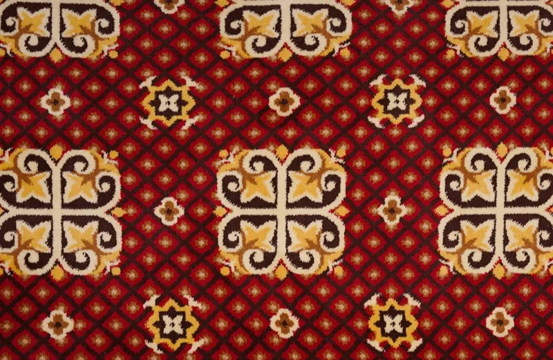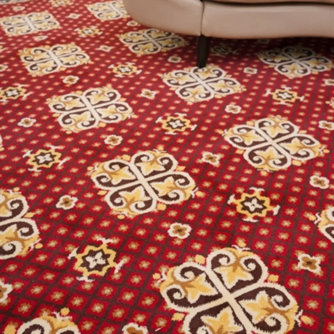 Thảm Văn Phòng VG là phiên bản thảm Wilton cao cấp mang phong cách cổ điển nổi bật, sử dụng gam màu đỏ trầm kết hợp hoa văn vàng – kem tinh xảo. Hình ảnh thực tế cho thấy thảm có độ dày tốt, bề mặt sợi cắt sắc nét, họa tiết đều và rõ ràng, đặc biệt phù hợp với các không gian cần sự sang trọng và ấn tượng như khách sạn, ballroom, hội trường, nhà hàng tiệc cưới và phòng họp lớn.