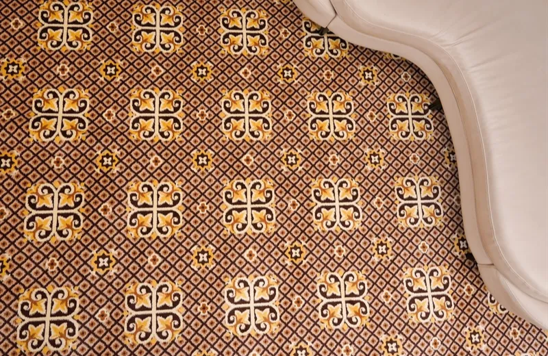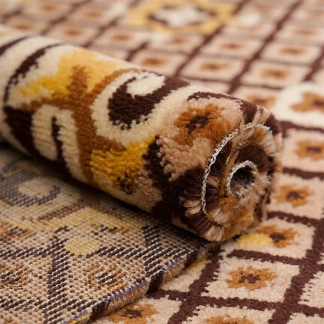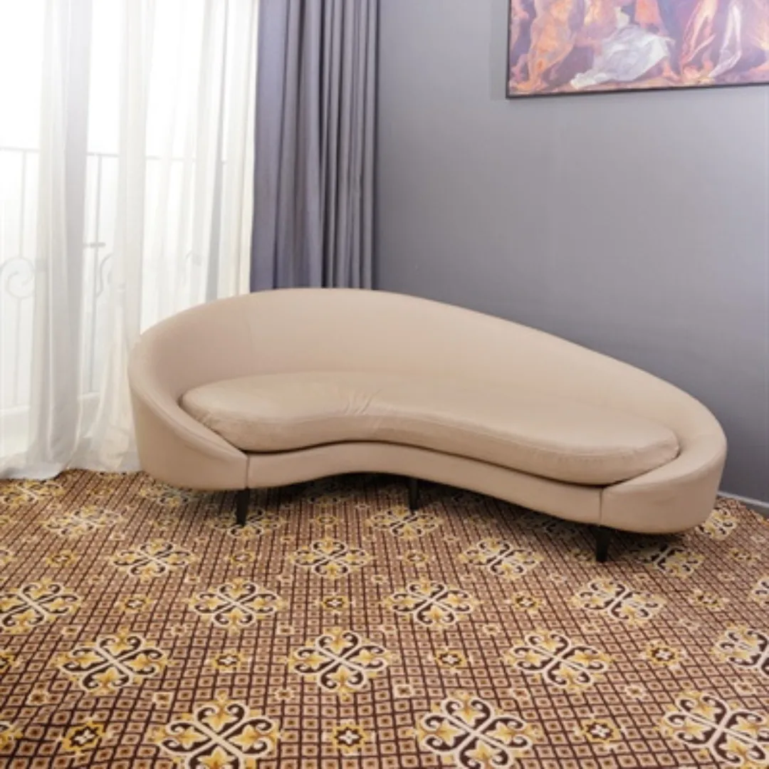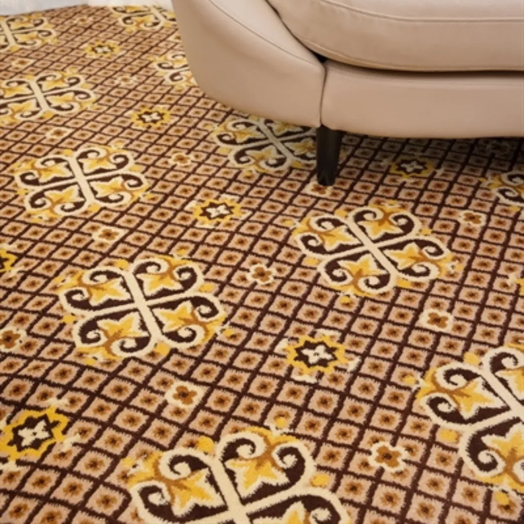 Gam màu nâu – vàng – kem giúp thảm dễ phối với nội thất từ hiện đại đến bán cổ điển. Khi kết hợp cùng sofa, ghế chờ hoặc nội thất khách sạn, thảm tạo nên tổng thể hài hòa, sang trọng nhưng vẫn giữ được cảm giác ấm áp, thân thiện.